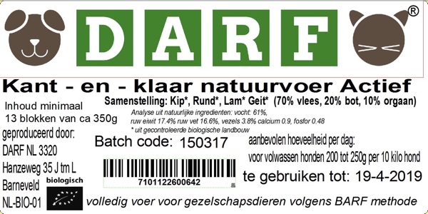 DARF is gebaseerd op het BARF principe waardoor voor een ieder de samenstelling eigenlijk wel duidelijk zou moeten zijn. Voedingsadvies voor een gemiddelde hond: 2 tot 2,5% per kilo lichaamsgewicht per dag. vb. een hond van10 kilo eet ongeveer 250gr per dag, dit kan uiteraard variëren van hond tot hond.